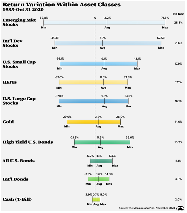 Sebbene le azioni dei mercati emergenti abbiano registrato il rendimento medio più elevato, hanno anche registrato la deviazione standard più elevata.