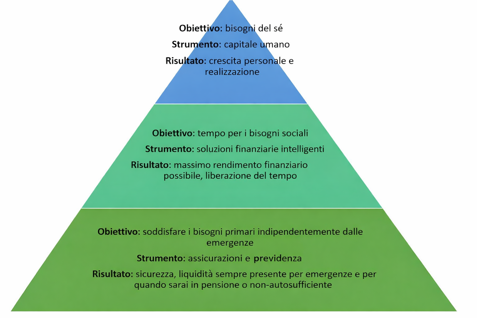 - Primo step: soddisfare i bisogni primari indipendentemente dalle emergenze. al fine, è possibile utilizzare strumenti assicurativi e previdenziali che garantiscono una liquidità sempre disponibile per affrontare eventuali imprevisti, la pensione o situazioni di non autosufficienza.